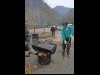 まず、ドラム缶で熱湯を作り、枝を煮る。次に、軟らかくなった枝の樹皮をむき、枝が熱いうちに慎重に曲げクセをつけながら、固定した木の穴に差し込み冷やす。最後にひもで固定して「輪かんじき」の命である、きれいなカーブの曲げ木ができあがる。この日作った曲げ木は外気で1カ月以上自然乾燥され、冬に行われる体験ツアーの出番を待つ。