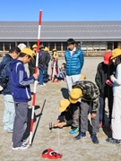 新しい金山小の校章と校歌を掲げる松山正人校長