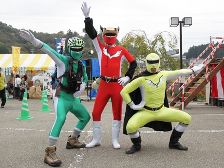 「勝手に丹生川応援戦隊 ヤマメンジャー」(左から)グリーン・レッド・イエロー。酔いつぶれて寝ていた3人の夢枕に、かつて同町に実在し乗鞍登山道を開拓した「板殿(いたんど)仙人」が現れ、「無理なくできることからコツコツやれ」とのお告げを受け変身できるようになったという