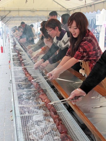 巨大飛騨牛串を焼く参加者たち