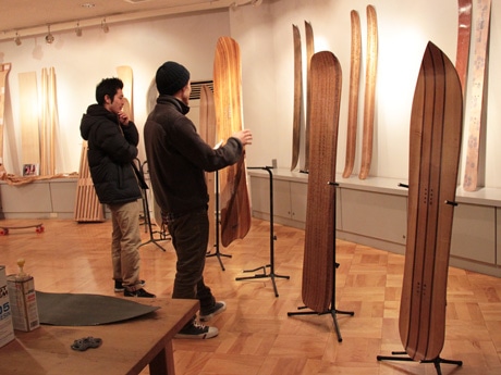 スギ間伐材や家具の廃材を利用したオリジナル木製スノーボードが並ぶ会場