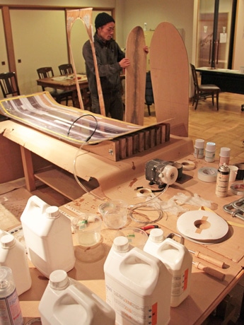 、リアルタイムで進行する木製スノーボードのハンドメード工程を見ることができる板製作実演ブース