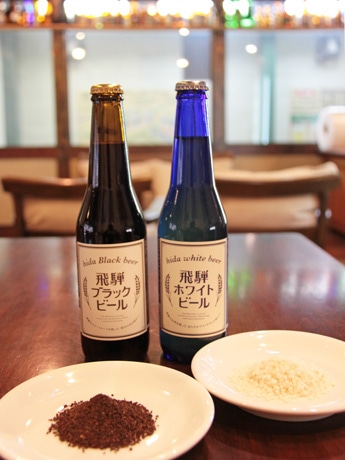 白川郷産の米を使った「飛騨ホワイトビール」(右)と、チョコレート麦芽やタカネコーンを使った「飛騨ブラックビール」(左)。12月下旬には2本セット「ブラック&ホワイト」を販売する予定