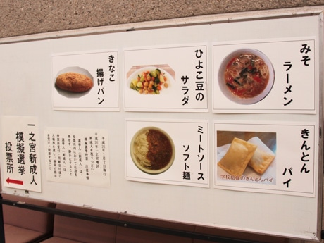 模擬投票所入り口に貼り出された給食メニューの候補ポスター
