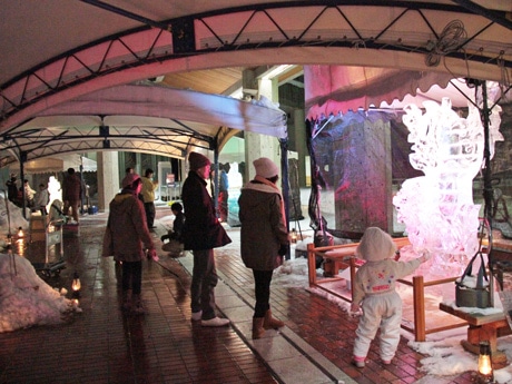 1月19日まで続く氷の彫刻ライトアップ会場の様子。点灯時間は日没後〜21時まで