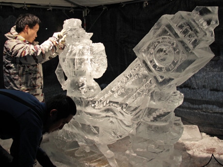 厳しいマイナス気温が続く屋外で作品制作に没頭する「中部氷彫会」メンバーたち