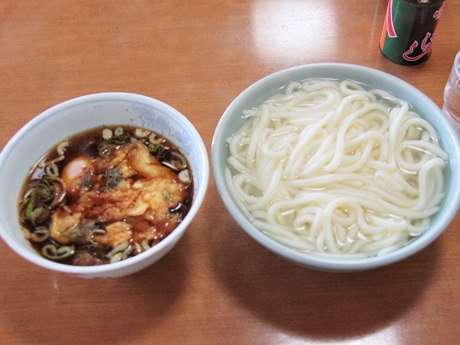 「湯付き」うどん2玉+トッピング(天ぷら・生卵)=490円