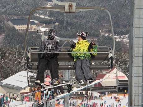 リフト券終日無料の特典を生かすコスプレ来場者(左)