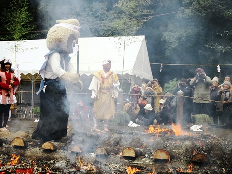 大勢の参拝客に見守られながら初めての火渡りに挑むくぅ