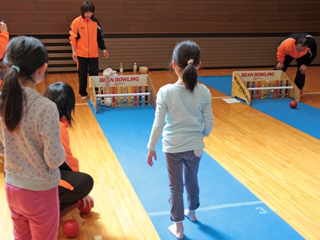 ボールを転がして9本のピンに当て、反転したピン数が得点となる「ビーンボーリング」