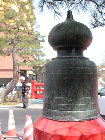 橋の西側両端に新しく設置した江戸時代に使われていたという擬宝珠。裏には「元文五丙申年 三月吉祥日」と刻銘されている