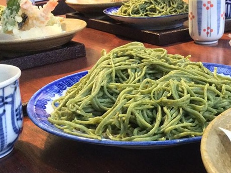 大麦若葉とスギナを練り込んだ手打ちの薬草そば。シンポジウム2日目に薬草天ぷらと共に販売する予定(『蕪水亭おはこ』で)