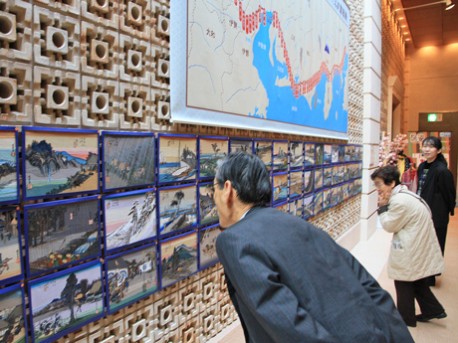 書家・西澤華功による立体作品「広重 東海道五十三次」に見入る来場者