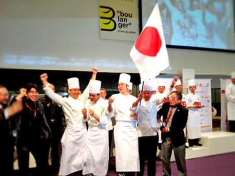 「2012 クープ・デュ・モンド・ド・ラ・ブーランジュリー」日本チーム キャプテン=成瀬正(トラン・ブルー)、パン部門=長田有起(神戸屋レストラン)、ヴィエノワズリー部門=佐々木卓也(ポンパドウル)、飾りパン部門=畑中尉夫(神戸屋レストラン)(写真提供=日仏商事)