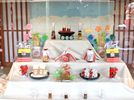 ひな人形と五人囃子=地元クラフト作家の作品、ぼんぼり=高根町の唐辛子製品、花=久々野町の桃ジュース、三人官女=トマト製品、お供えにも各地の特産品が並ぶ