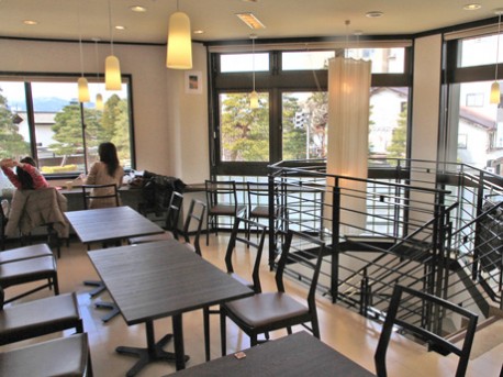 見晴らしの良い2階席の窓からは観光名所の「高山陣屋」と「中橋」が一望できる