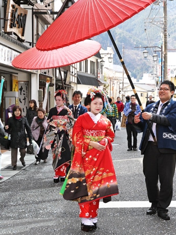 「きれいだね」「かわいいね」「頑張ってね」と道行く人が皆笑顔で出迎え祝福に包まれた下呂温泉街