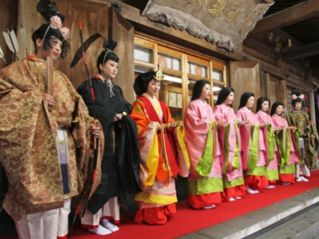 飛騨地域から選出された9人の未婚女性が、内裏、后、右大臣、左大臣、官女姿にそれぞれ扮する