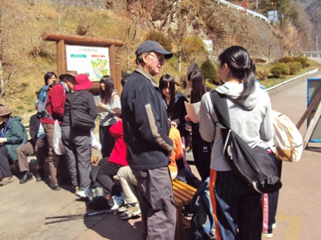 滝めぐり出発地の「がんだて公園」で会話を交わす両者