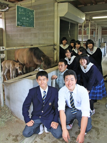 「春陽」の名前を考えた飛騨高山高動物研究部・木曽馬班のメンバー。毎日木曽馬の世話をしながら、乗馬の調教などを行っている