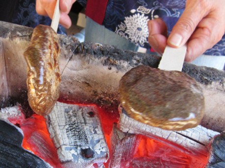五平餅は、木の棒にご飯を平たく固め付け、すり鉢で擦った「あぶらえ(=エゴマ)」を砂糖、しょうゆなどで味付けした「たれ」を塗って焼いた飛騨の郷土料理