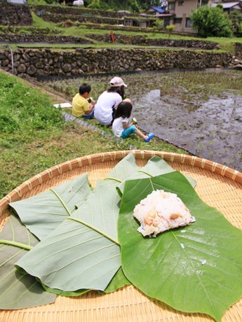 無事に田植えが終わった田んぼを眺めながら、振る舞われた「朴棄ずし」を食べる子ども参加者。「鮭の切り身」「竹の子」「ショウガ」などを「酢めし」に混ぜ込み、朴の棄で包んだ「朴棄ずし」は、初夏のこの時期、飛騨益田地方を中心に各家庭で盛んに作られる飛騨の伝統郷土料理の一つ