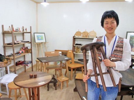 「『ここにくるとワクワクするね』と言ってもらえるようなお店にしたい」と話す店長の関西さんと店内の様子。店内にはクリ・ナラ・サクラ・ブラックウォールナットなどの無垢材を使った家具や小物、国内外から集めた和洋アンティーク雑貨や小物、地元クラフト作家のアクセサリーなどが並ぶ。