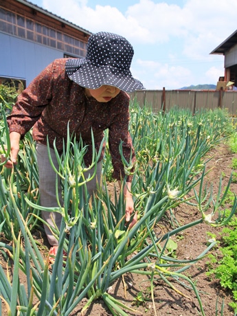 春先までは普通の青ネギと見分けが付かないが、5月下旬ころから独特の形になりはじめるという「やぐらネギ」。この姿で収穫できるのは、ほぼ6月末までだという