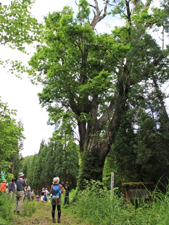 胴回り約5メートル・高さ20メートル以上・推定樹齢900年というミズナラの巨木「通称・彦左衛門(ひこざえもん)さん」と出会う参加者たち