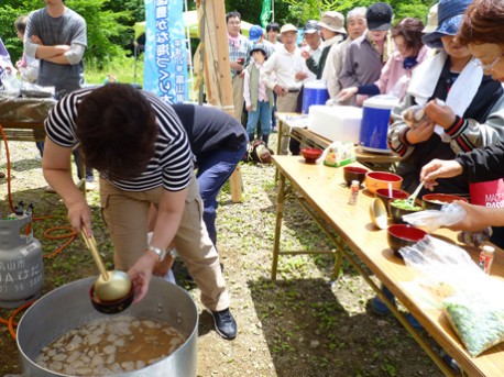 みそ仕立ての汁に、魚のすり身やホタテなど富山産の魚介類と飛騨産のキノコや野菜がたっぷり入った「山海汁」が参加者全員に振る舞われた
