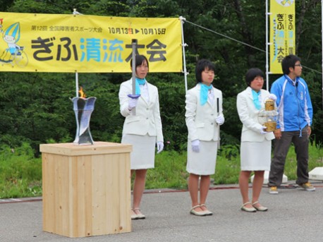 今年2月に行われた冬季国体スキー競技で5位入賞を果たした二俣友里さん(飛騨高山高)らが採火者を務めた式典の様子(7月16日)