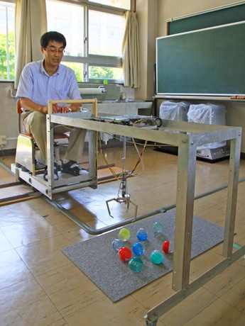 過去に課題研究で使われた装置の部品など、あり合わせの物を寄せ集めて作ったという「乗車式UFOキャッチャー」