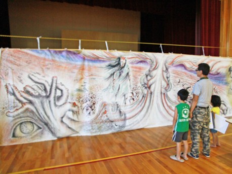 昭和巨大絵巻の原子爆弾投下場面を見つめる親子連れ