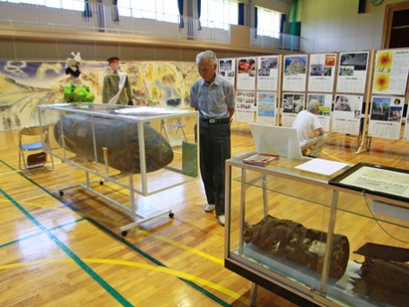 高山市清見町に米軍が落下した「空襲予告チラシ付きの不発弾」など、1000点以上の戦争関係資料を展示した「平和展」会場