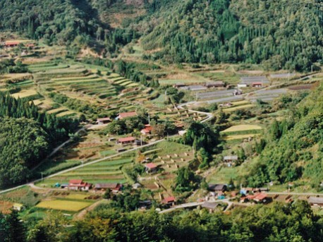 1991年ごろの旧丹生川村折敷地五味原(ごみはら)地区。おいしい作物がたくさん収穫できることから「五味」と名付けられたこの集落には縄文時代から人々が暮らしていたといわれ、古い民話や伝承も数多く残されていた。建設予定当時16世帯あった家々は平成5年に近隣の大萱地区に集団移転した