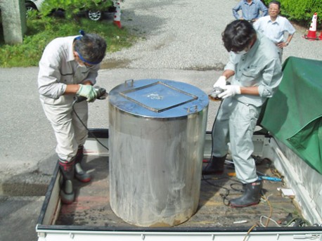 グラインダーを使ったタイムカプセルの開封作業