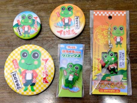 写真右から=ストラップ、ゲロックス(クロックスに装着可能)、缶バッジ(大・中・小から一つ選択)