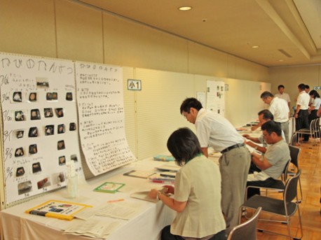 生徒児童らの研究作品を熟読し、真剣なまなざしで審査する理科教諭ら