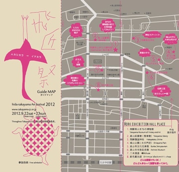 「共生」を示すツルとカメがあしらわれたガイドマップ。博物館前で土壁塗りの左官体験、図書館に光る大きな物、鍛冶屋と写真のコラボなど、今までと違う視点で高山の町を表現する