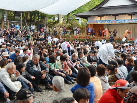 境内では酒宴の余興として、奉芸殿で獅子舞、闘鶏楽、民謡踊りなどの伝統芸能がにぎやかに披露され盛り上がった