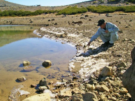 乗鞍岳・鶴ヶ池の「初氷」。当時の天気は晴れ、気温4度、氷の厚さは約5ミリ(22日10時30分、乗鞍スカイライン管理事務所パトロール隊撮影)