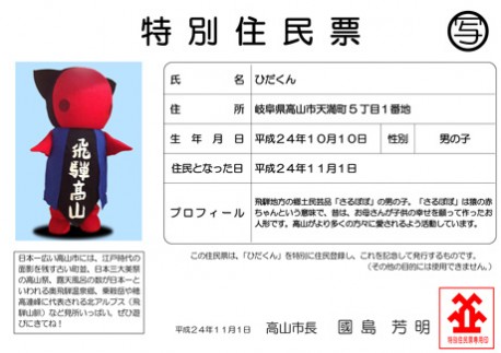 飛騨の郷土民芸品さるぼぼの男の子「ひだくん」の特別住民票。