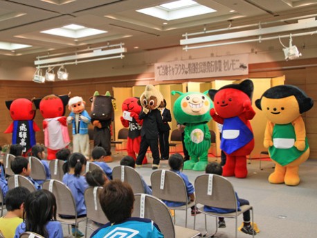 写真左奥から「ひだくん」「たかちゃん」「遊湯(ゆうゆ)」「も〜かるくん」「ひだっち」「お猿のくぅ」「ヒットくん」「しんちゃん」「くみちゃん」