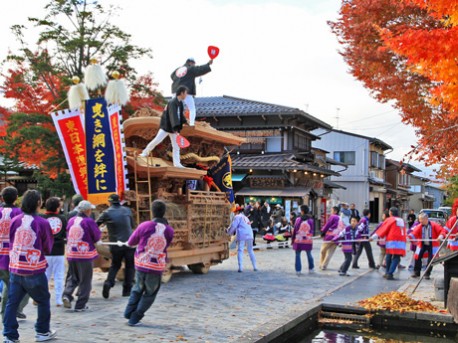 「東日本復興支援」「曳き綱を絆に」ののぼり旗を背に飛騨古川の町並みを進むだんじり