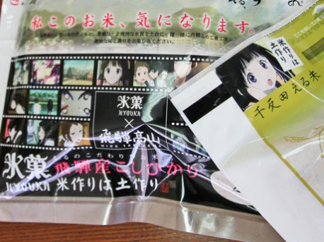 「米作りは土作り」など、作品中のヒロインのセリフやアニメの1シーンがプリントされた米袋