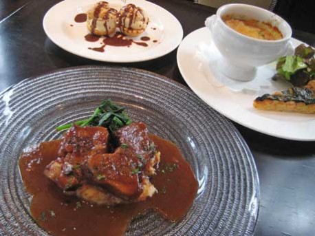 「ルオーランチ」(2500円)。ルオーの愛したスープやデザートをはじめ、牛ほほ肉の赤ワイン煮込みやキッシュ、パンとドリンクのコースメニュー。サイドメニューで「エスカルゴのココット」(700円)も。