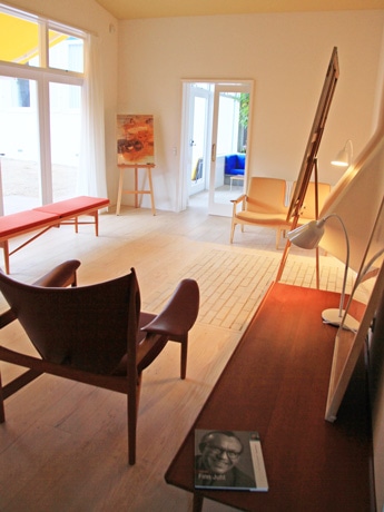 建物全体を白いキャンバスに見立て、自然から取り入れた光が色彩や物のデザインを際立たせるフィン・ユール邸内の様子
