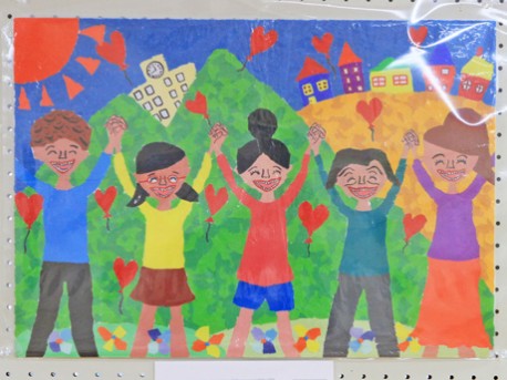 新しい金山小の校章と校歌を掲げる松山正人校長