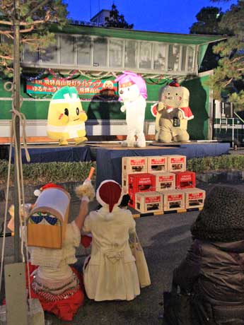 ステージ左から=「いなっピー」(愛知県稲沢市)、「ひこちゅう」(滋賀県彦根市)、「わたる」(兵庫県瀬戸内市)