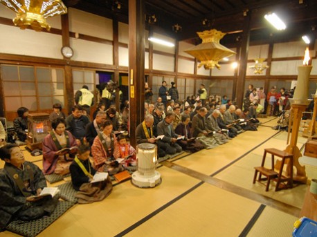 会場寺院で多くの参拝客を出迎える巨大和ろうそく(右端)